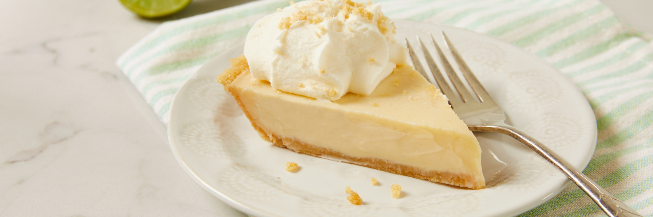 Tangy fresh key west lime filling mixed with whole whipping cream and powdered sugar for a perfect mix of sweet and tart made on our fresh-baked graham cookie crumb crust