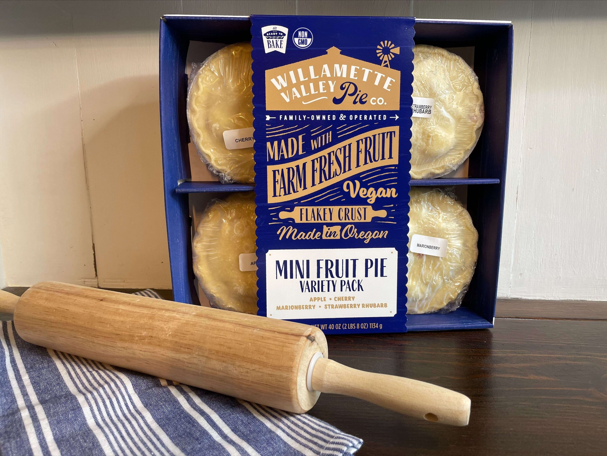 These 5”, 10-ounce mini pies, ¼ the size of our big pies, utilize sustainably sourced palm oil to offer a delicious variety of flavors – Apple, Cherry, Marionberry and Strawberry Rhubarb. These pies are VEGAN. 4 per case